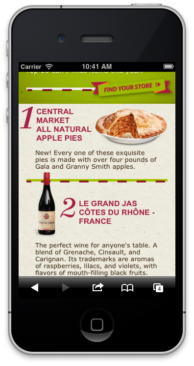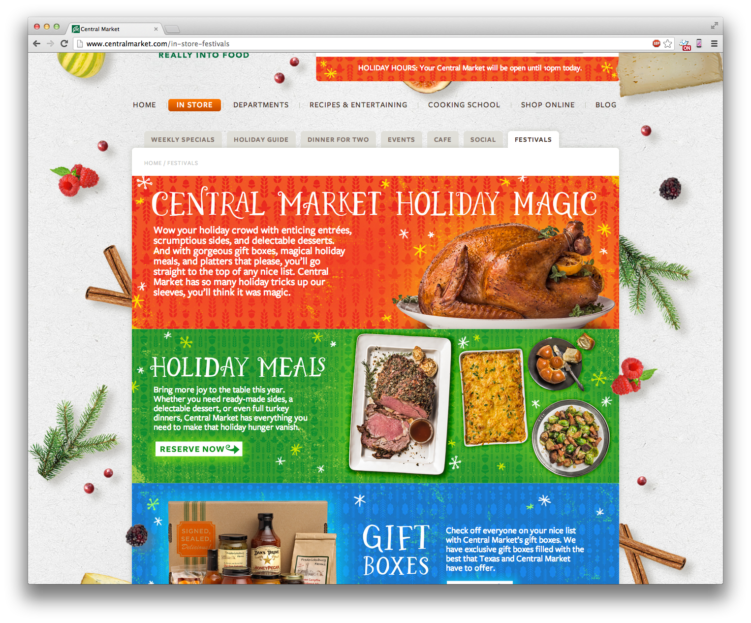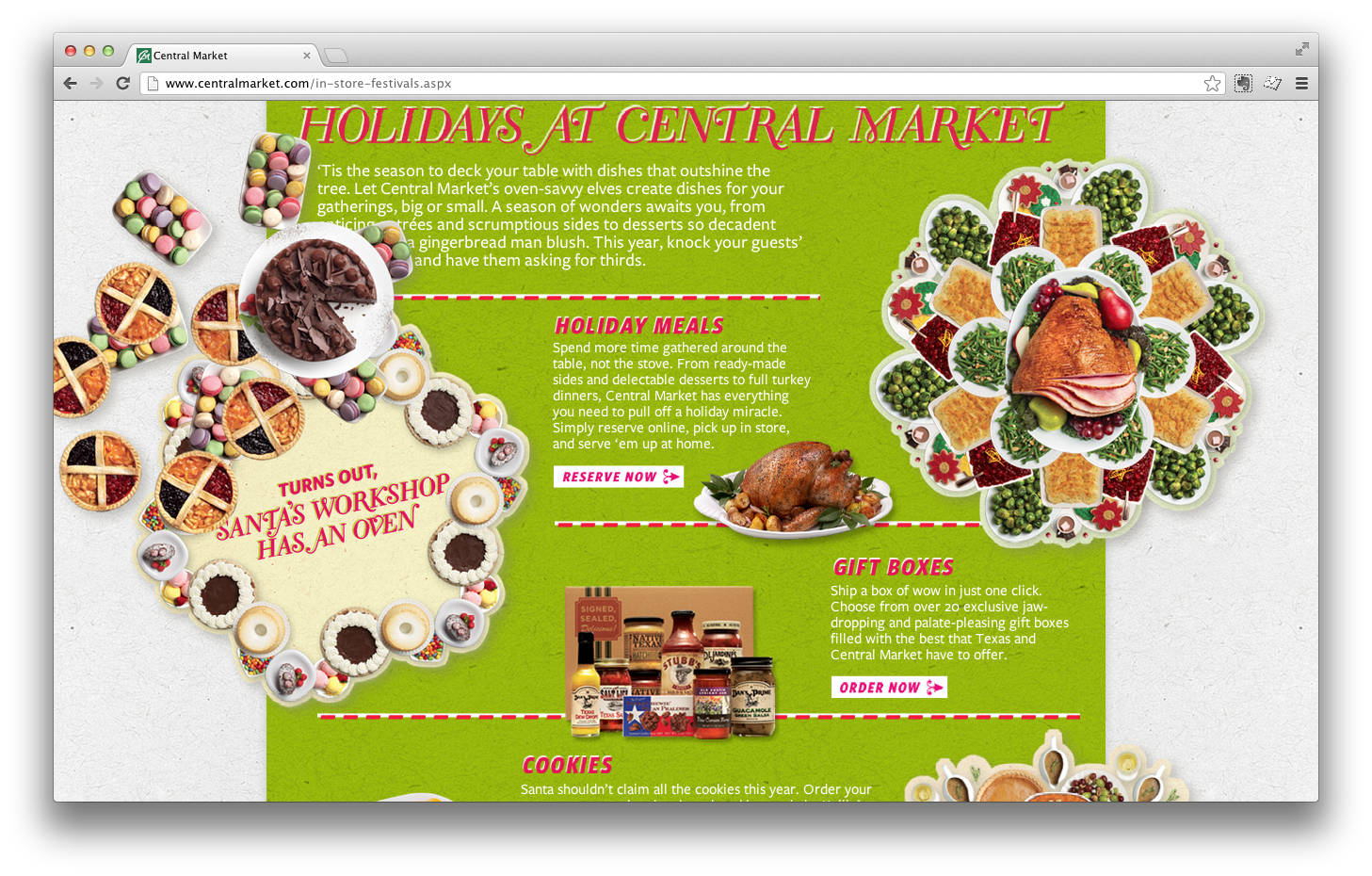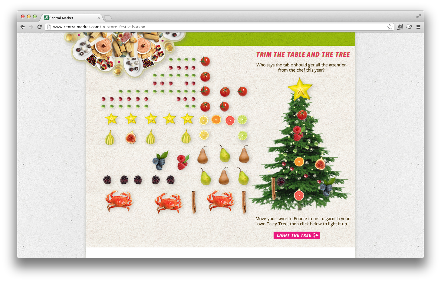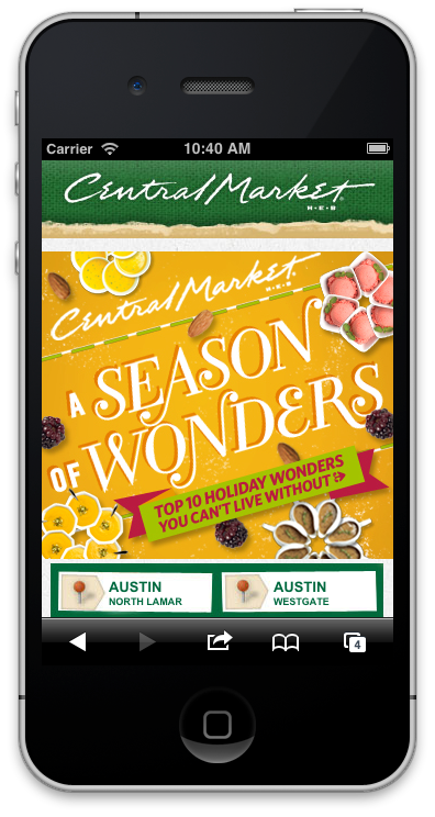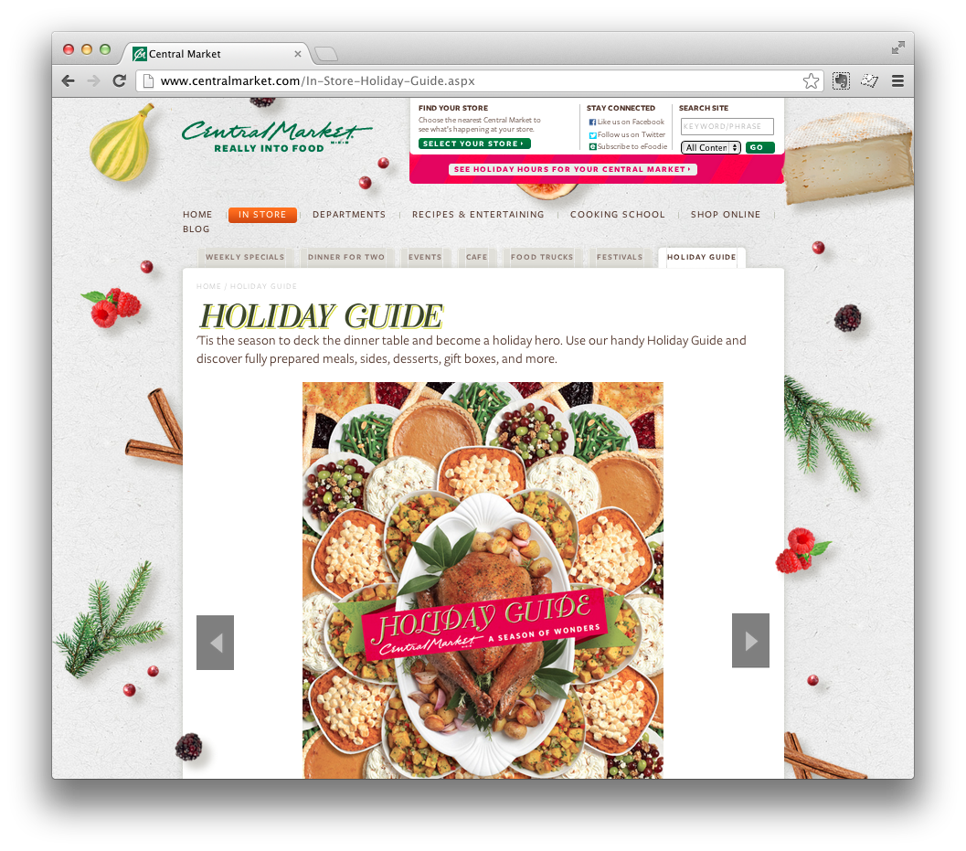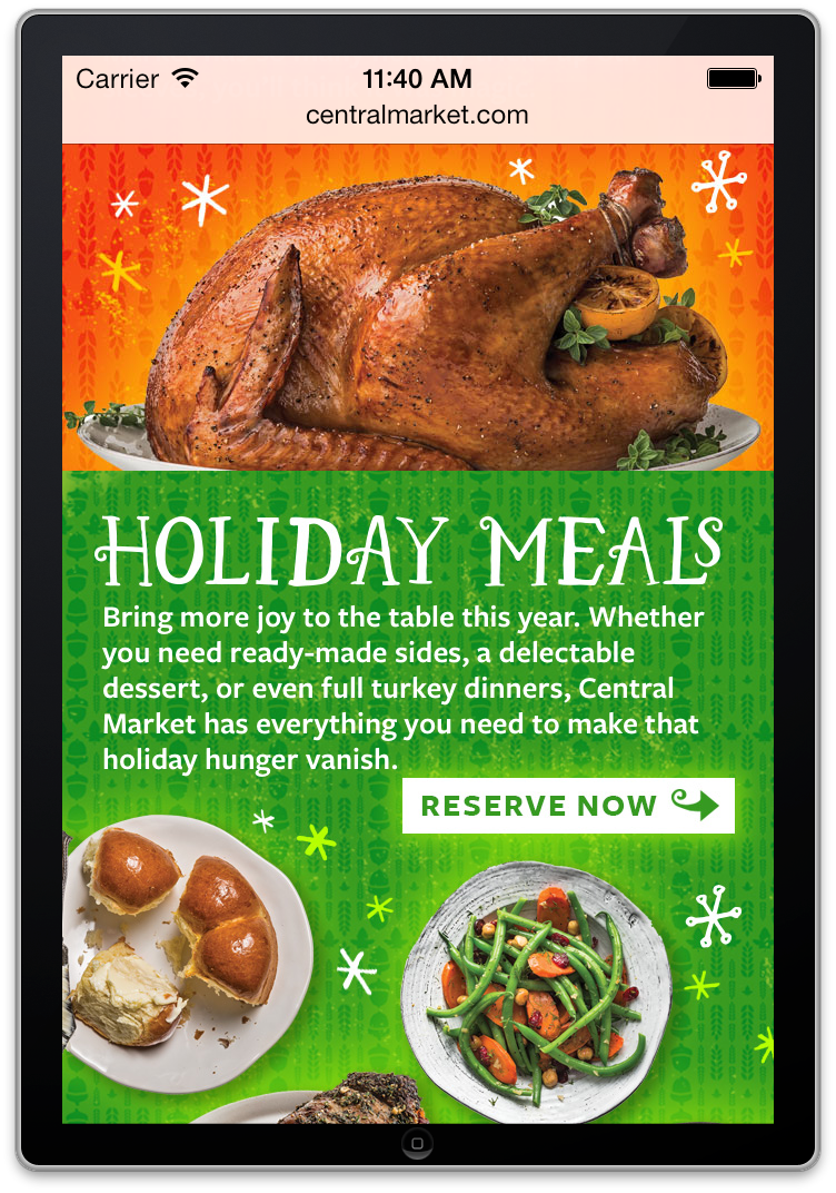The Texas-based specialty grocery store, Central Market, knows how to make the holidays festive. I got to make this HTML takeover to celebrate all of the holiday options, complete with mini slideshows, tree decorating, moveable food pieces, and a mobile top 10 items to buy.