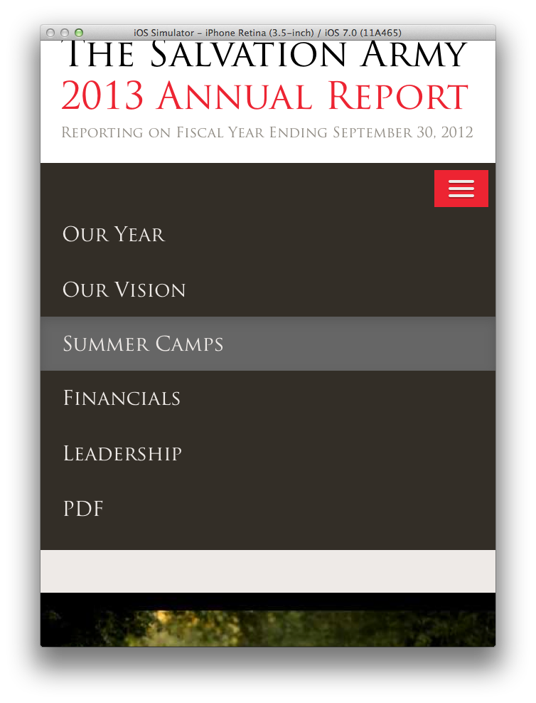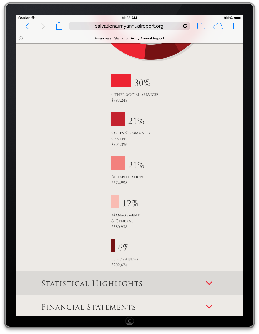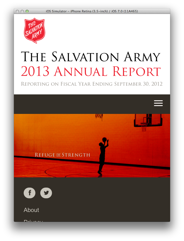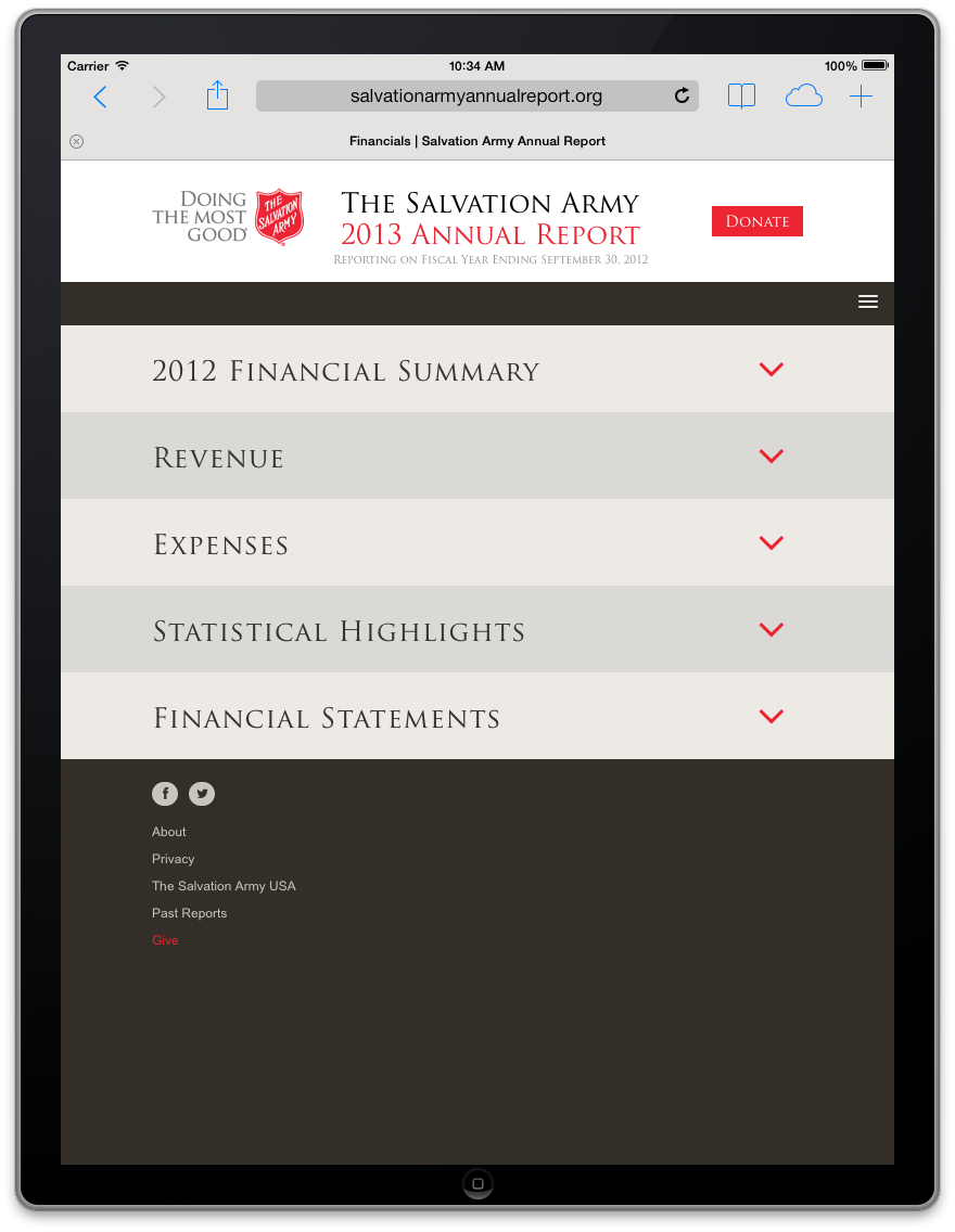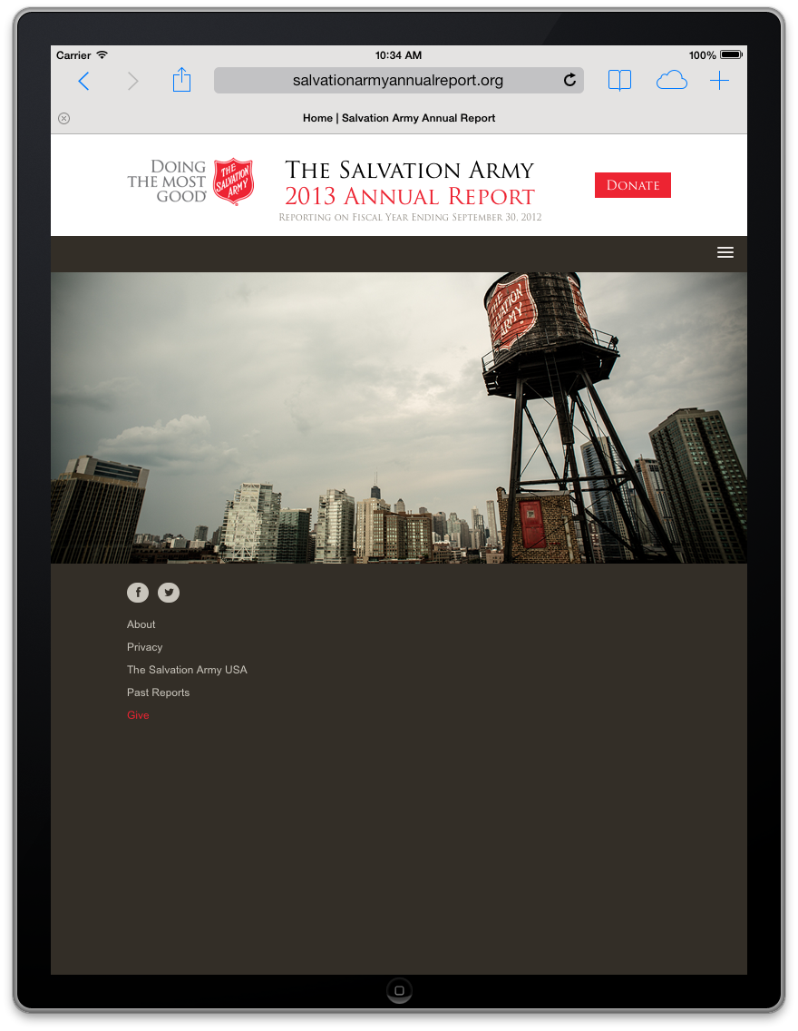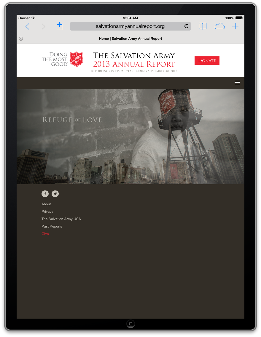 Salvation Army has been a long-time client of The Richards Group. Our team had built them a flash site for their annual report. This year we wanted to give it an update, but not change too much of the design. I worked with the art director to explain how we could change the layouts to be flexible enough for a responsive layout. We were all pleased with the smooth transition from flash to HTML 5.