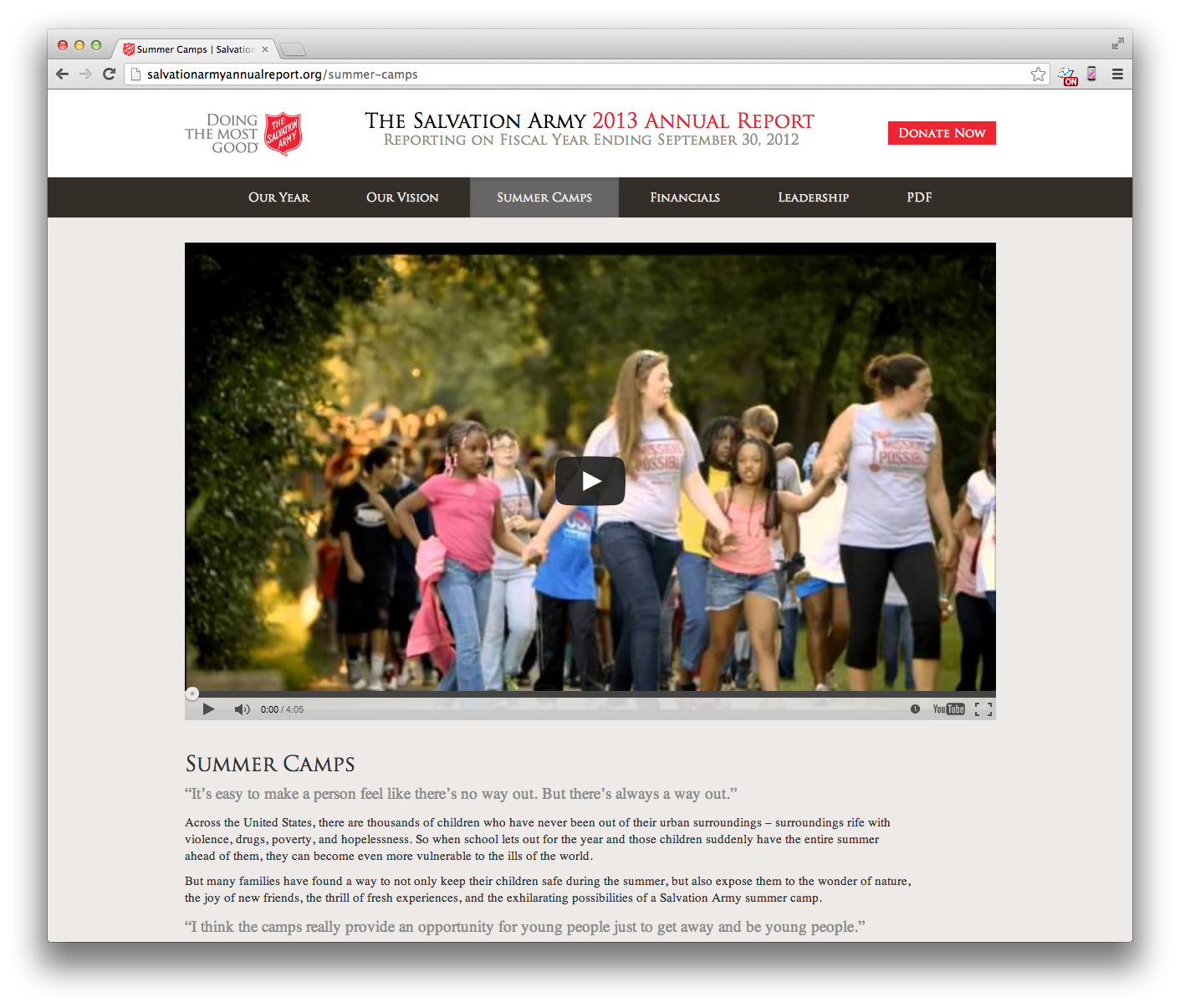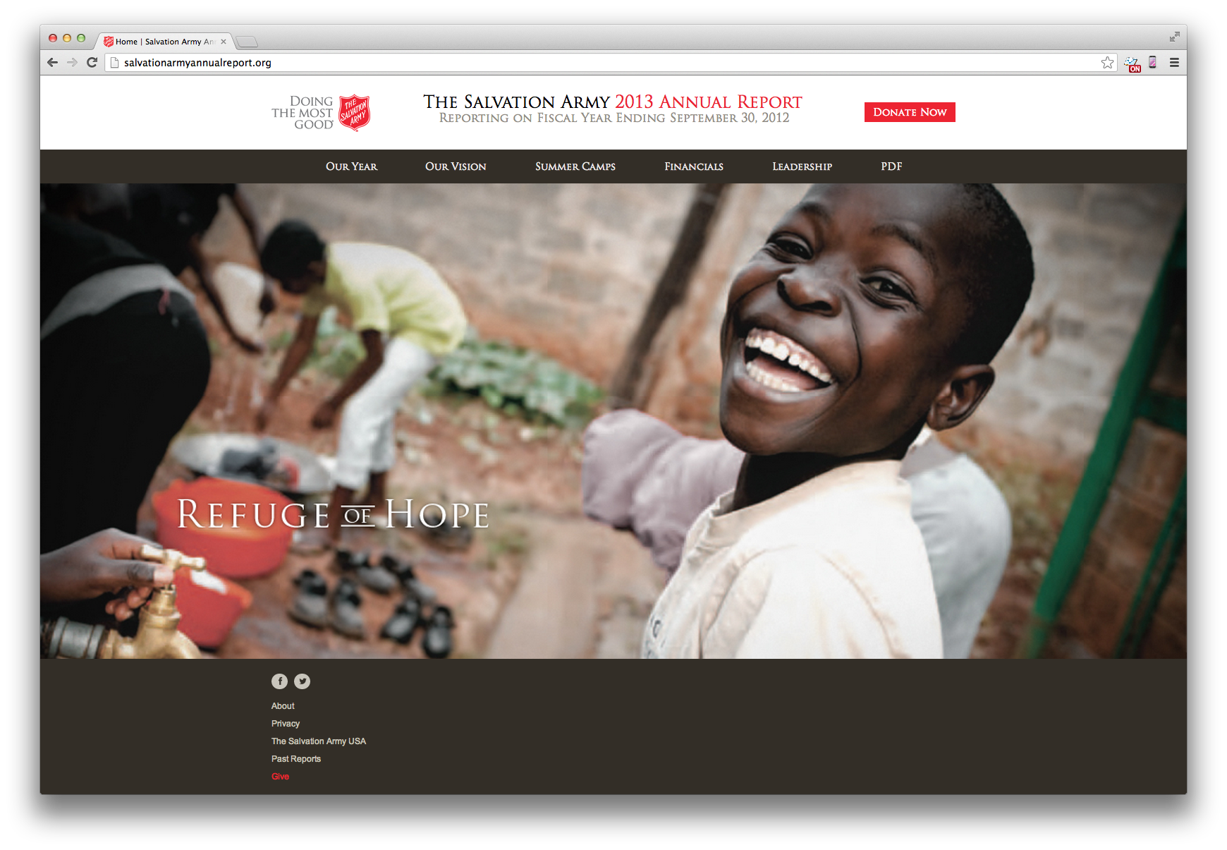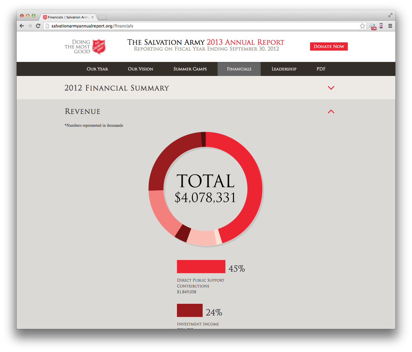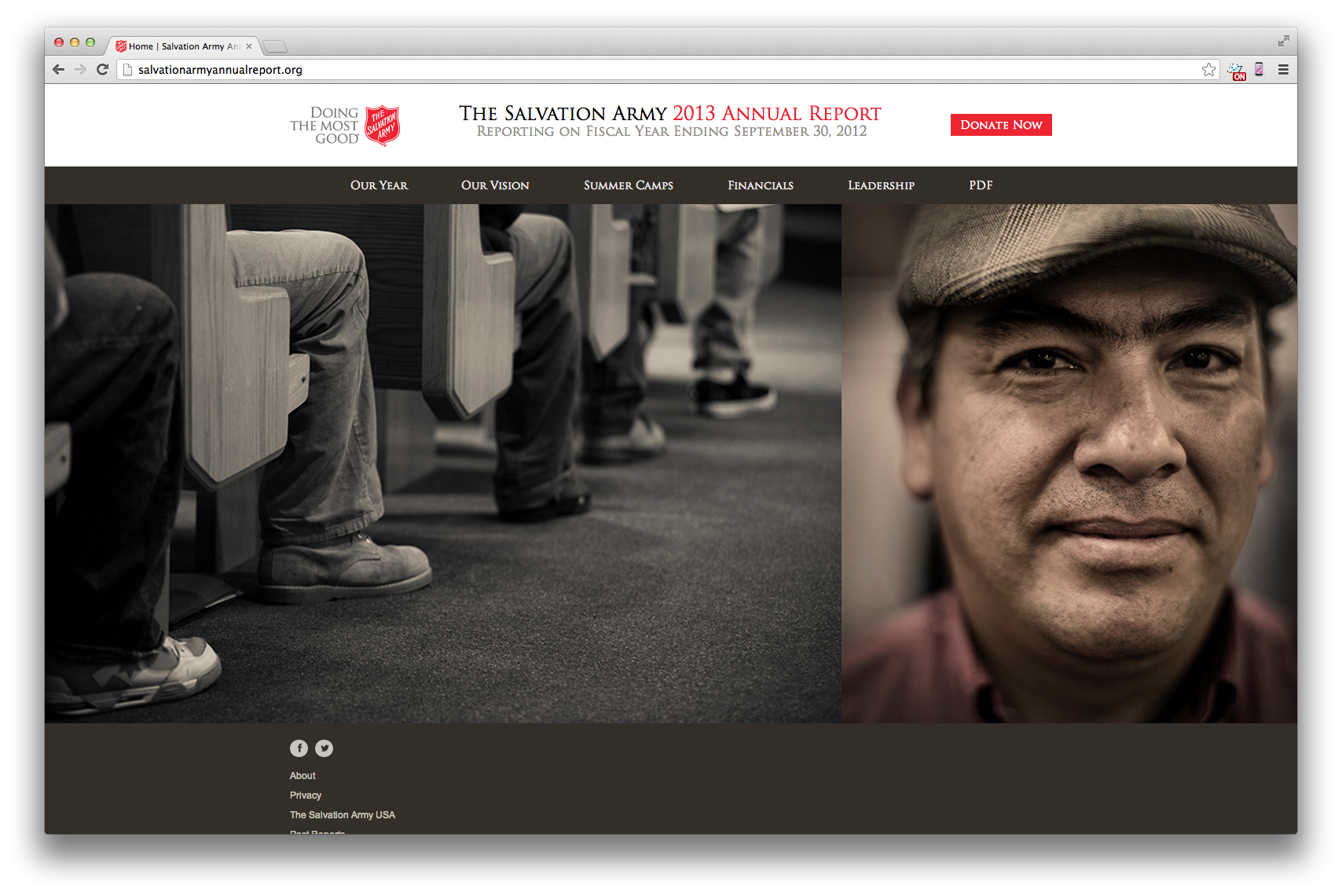 Salvation Army has been a long-time client of The Richards Group. Our team had built them a flash site for their annual report. This year we wanted to give it an update, but not change too much of the design. I worked with the art director to explain how we could change the layouts to be flexible enough for a responsive layout. We were all pleased with the smooth transition from flash to HTML 5.